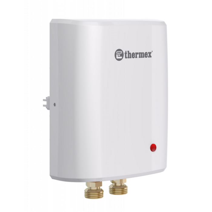 Водонагрівач (бойлер) Thermex Surf 3500 виготовляється у прямокутному корпусі із пластику білого кольору. Залежно від підведення труб – верхньої чи нижньої – він монтується вертикально на стіну приєднувальними патрубками у відповідний бік. Модель висотою 19,4 см, шириною 13,5 см та глибиною 8 см нагрівається мокрими ТЕНами з нержавіючої сталі потужністю 3,5 кВт. Вони поміщені в нагрівальну колбу із термостійкого пластику, через яку проходить вода. Температура нагрівання рідини регулюється зниженням або підвищенням напору, тому слід брати до уваги початкову температуру води: влітку вона більша (приблизно +20°С), а взимку менша (+5°С). Також слід врахувати, що вихід води має бути безперешкодним і до нього заборонено приєднувати будь-яку арматуру. Водонагрівач (бойлер) Thermex Surf 3500 здатний виконувати нагрівання до максимальної температури +60С, а його робочий стан підтверджується світловим індикатором, що горить.