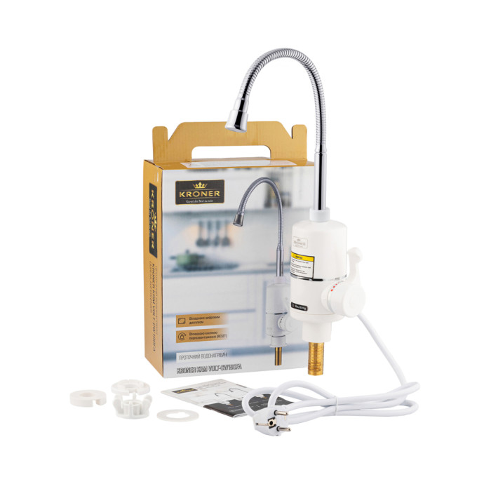 Проточный водонагреватель Kroner KRM Volt-CW190RFA заменяет обычный смеситель и водонагреватель, обеспечивая постоянный нагрев воды в одной точке. Использование Kroner KRM Volt-CW190RFA экономит полезное пространство на кухне и средства на покупку дополнительного оборудования. Гибкий излив вращается на 360° и тем самым позволяет настраивать направление потока воды. Нагрев воды осуществляется за счет ТЭНА из нержавеющей стали мощностью 3000 Вт, который мгновенно нагревает проходящую через него воду. Установка и подключение водонагревателей не требует специальных навыков и оборудования – монтаж можно провести самостоятельно, все необходимое для подключения уже есть в комплекте.