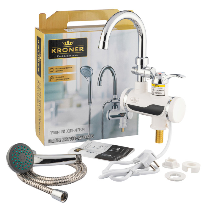 Проточный водонагреватель Kroner KRM Volt-CW190RFA заменяет обычный смеситель и водонагреватель, обеспечивая постоянный нагрев воды в одной точке. Использование Kroner KRM Volt-CW190RFA экономит полезное пространство на кухне и средства на покупку дополнительного оборудования. Гибкий излив вращается на 360° и тем самым позволяет настраивать направление потока воды. Нагрев воды осуществляется за счет ТЭНА из нержавеющей стали мощностью 3000 Вт, который мгновенно нагревает проходящую через него воду. Установка и подключение водонагревателей не требует специальных навыков и оборудования – монтаж можно провести самостоятельно, все необходимое для подключения уже есть в комплекте.