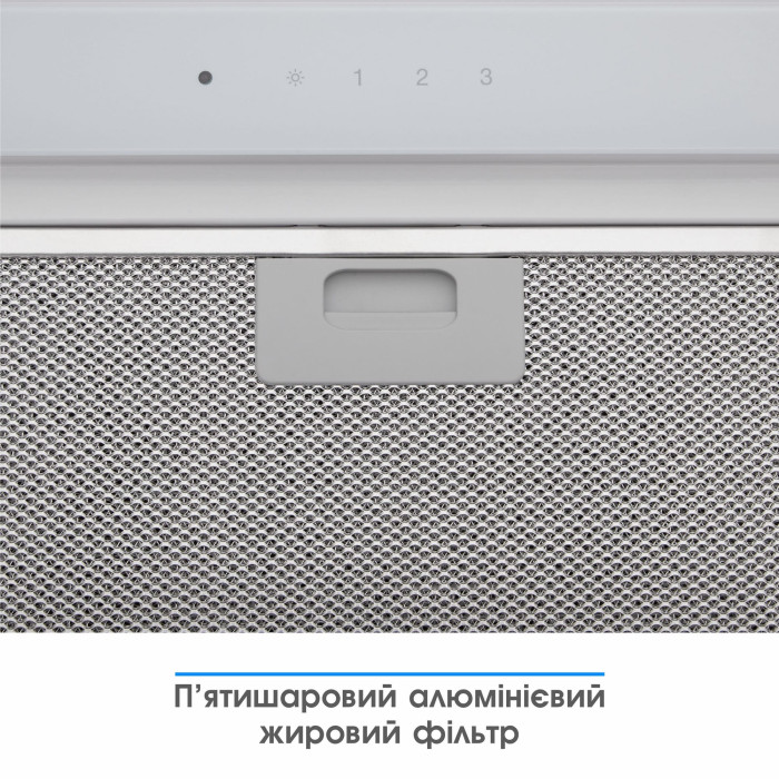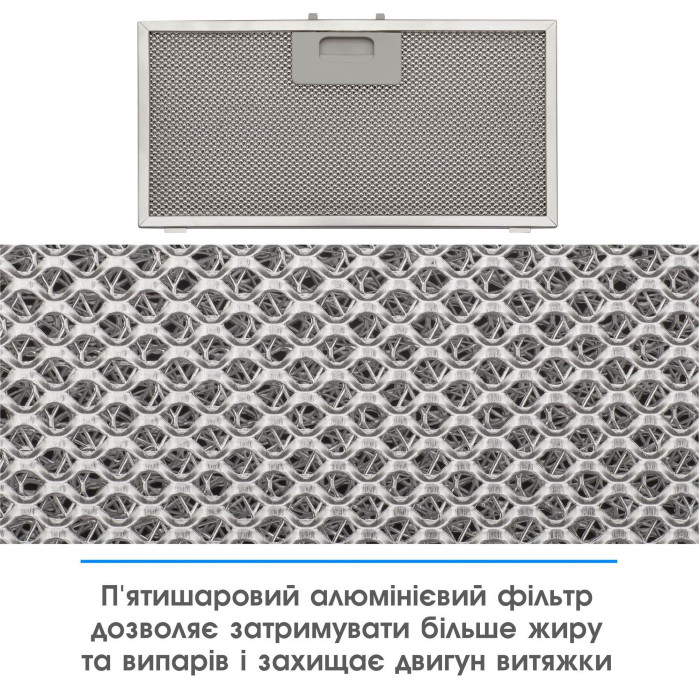 Надійний 5-шаровий алюмінієвий фільтр поглинає дрібні частинки жиру та захищає двигун витяжки. Для легкого очищення достатньо вийняти його і помити в гарячій воді або посудомийній машині.