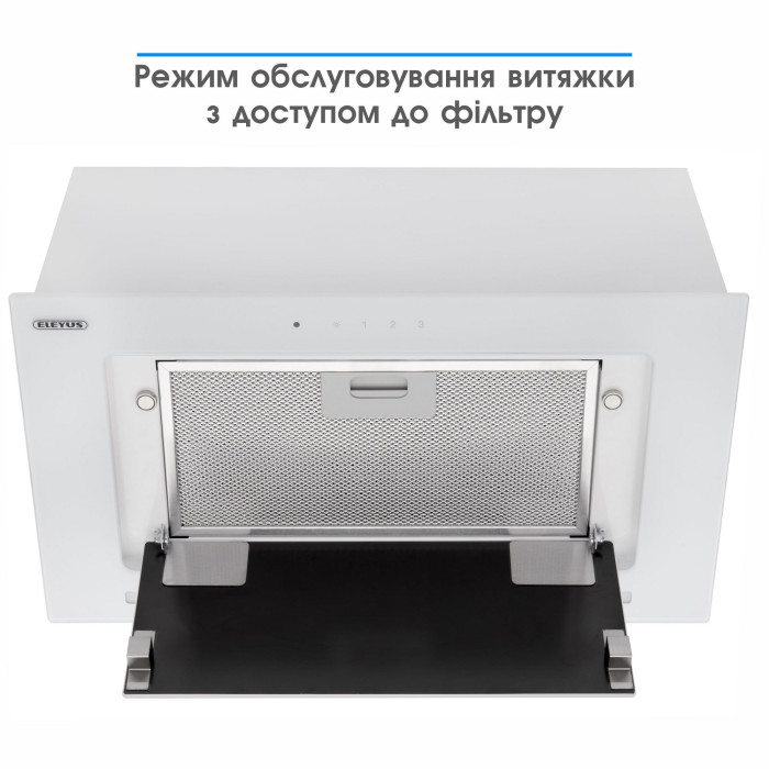 Витяжка повністю монтується в кухонну шафу шириною 60 см. Видимою залишається частина, виготовлена з міцного та гарного загартованого скла. Його гладка поверхня створена для легкої очистки, а елегантний дизайн гармонійно доповнить інтер'єр вашої кухні.
